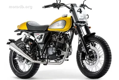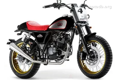 Debajo del depósito pulido, pintado y barnizado a mano, se encuentra un monocilíndrico de 124 cm3 refrigerado por aire, dos válvulas por cilindro, y una caja de cinco marchas. La potencia anunciada es de 12 caballos a 8750 revoluciones por minuto. Es prudente, es honesta, y es exactamente lo que se esperaba de una moto a 2695 euros. El chasis de tubos de acero acoge una horquilla invertida de 38 mm y dos amortiguadores laterales en la parte trasera, una dotación suspendida que halaga el aspecto más que promete una estabilidad de conducción agonística. A modo de comparación, una Keeway RKS 125 o una Brixton Cromwell juegan en registros vecinos, pero ninguna reclama tan claramente la herencia del flat track estadounidense.