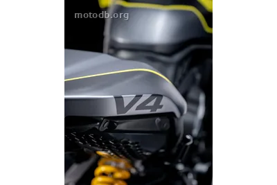 La silhouette est dense, presque compacte malgré les 1593 mm d'empattement. Le pneu arrière de 240 mm écrase le sol avec une désinvolture provocatrice, la double signature lumineuse en C inversé donne un regard à nul autre pareil, l'échappement à quatre sorties affiche sans complexe l'architecture V4. Le cadre monocoque aluminium a remplacé le treillis tubulaire, ce qui ne manquera pas de chagriner certains. Les suspensions, fourche inversée de 50 mm et monoamortisseur Sachs entièrement réglable, font le travail sérieusement même si, à 27490 euros, on aurait légitimement espéré de l'Öhlins. La selle à 790 mm reste accessible pour un gabarit moyen, et le guidon raproché de 20 mm par rapport à la génération précédente rend la position moins contraignante sur route.